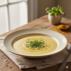 Crema de coliflor sedosa con un toque de curry. Una receta ligera, antiinflamatoria y muy fácil de preparar.