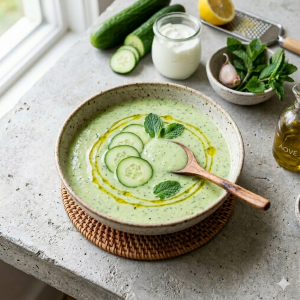 Una sopa fría refrescante, nutritiva y baja en carbohidratos. Perfecta para el verano y para dietas antiinflamatorias y detox por su alto contenido en agua, fibra y probióticos naturales del yogur griego.