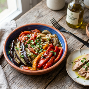 Un clásico de la dieta mediterránea basado en hortalizas asadas. Es una receta alta en fibra, rica en antioxidantes y perfecta para la gestión del peso debido a su baja densidad calórica y alto poder saciante.