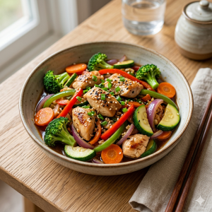 Salteado de verduras y pollo con salsa de soja