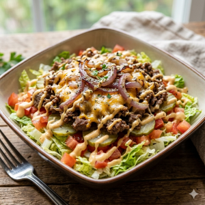 Disfruta de todo el placer de una hamburguesa en forma de una ensalada. Esta Burger Salad combina la frescura de la lechuga y el tomate con la potencia de la carne picada con queso fundido y una cebolla a la plancha irresistible. El toque final lo pone nuestra salsa especial casera, ligera y cargada de sabor.